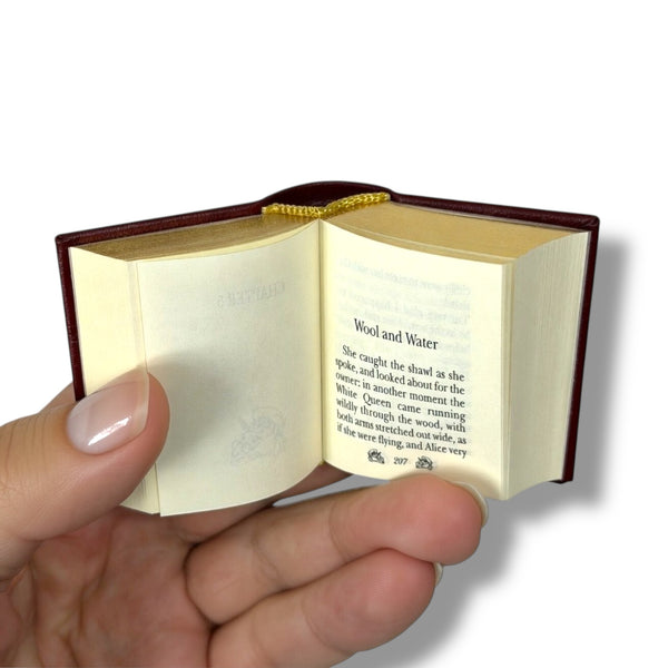Discover this enchanting miniature edition of Lewis Carroll's classic Through the Looking-Glass, and What Alice Found There. Measuring just 53 x 38 mm (2.1 x 1.5 inches), this tiny hardcover features the complete original English text across 510 pages, bound in elegant Cabra with a protective slipcase. Perfect as a unique collectible, dollhouse accessory, literary keepsake, or whimsical gift for Alice fans and book lovers. A true marvel of miniature bookmaking!